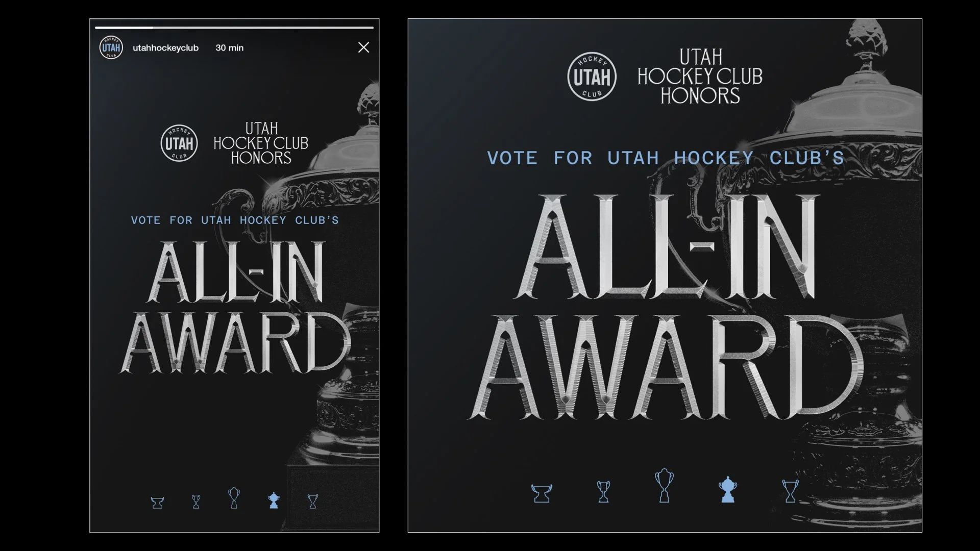 This was the first-ever award ceremony that we put on for the Utah Hockey Club. The ceremony was post-game of the last game of the season. Hockey Ops awarded 5 awards to the players - we created a full show look which included a custom type treatment and look, full-arena takeover for the show plus a unqiue set of graphics for each award.